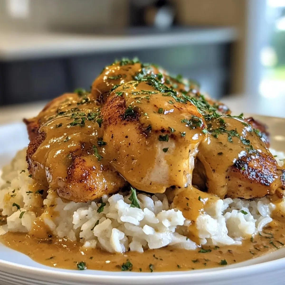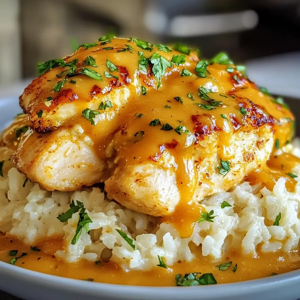 - Return the cooked chicken to the skillet, spoon the creamy sauce over the chicken, and serve over fluffy rice.