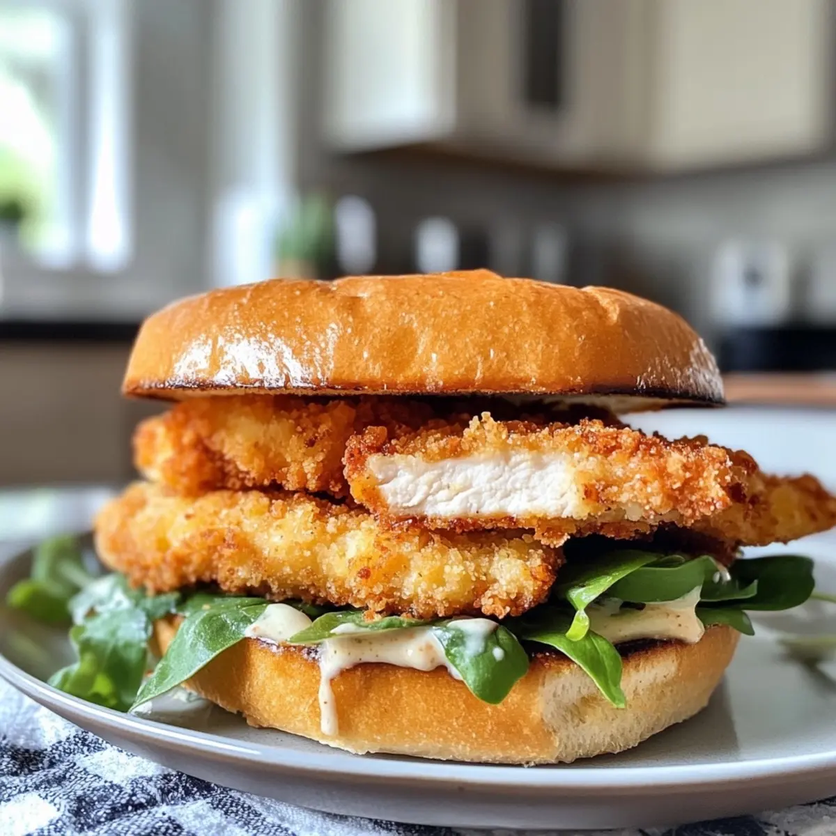 - Slice the baguettes open, spread the creamy Caesar dressing inside, layer with the crispy chicken cutlet, and top with fresh Caesar salad. Serve immediately.
